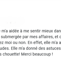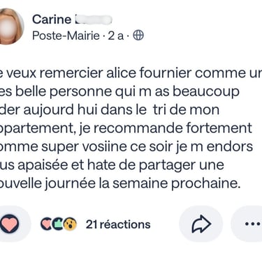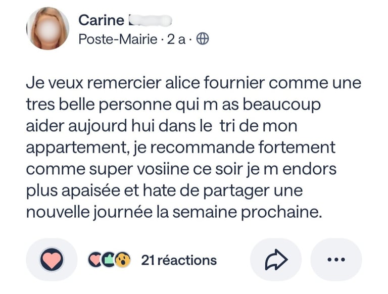 "Grâce à l'aide précieuse d'Alice j'ai eu plus qu'une aide ménagère mais aussi un soutien moral pour y voir plus clair dans mon organisation !!"