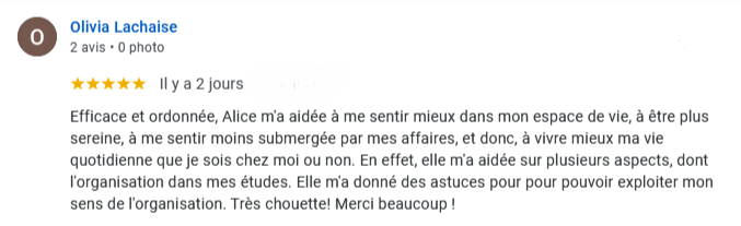 ”J’ai fait appel a Alice dans le cadre d’un changement familial. Elle a été très à l’écoute et m’a aidée à entreprendre un tri par catégorie d’objet, grâce à une méthode structurée.